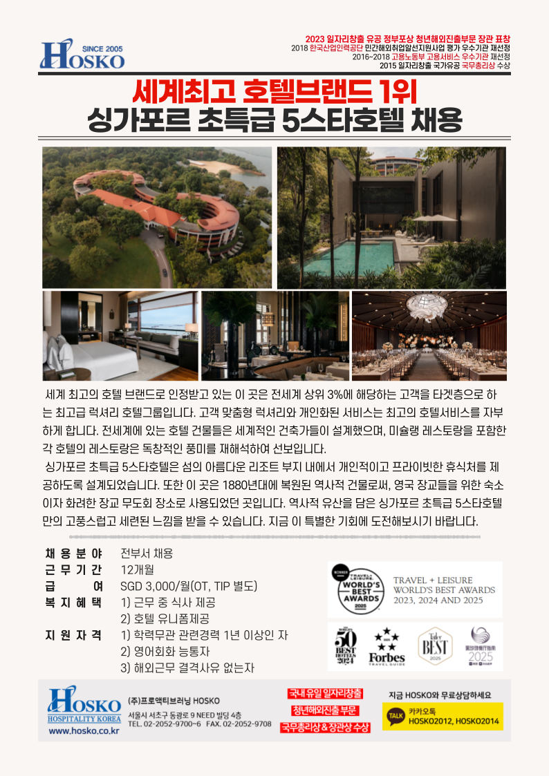 [호스코] 싱가포르 1위 5스타 초특급호텔 채용